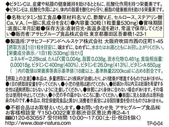 【仕様】[原材料]V.C、セルロース、ピロリン酸鉄、ステアリン酸Ca、増粘剤(プルラン)、葉酸生産国:日本商品区分:健康食品メーカー:アサヒグループ食品広告文責:フォーレスト株式会社 0120-40-4016【備考】※メーカーの都合により、パッケージ・仕様等は予告なく変更になる場合がございます。